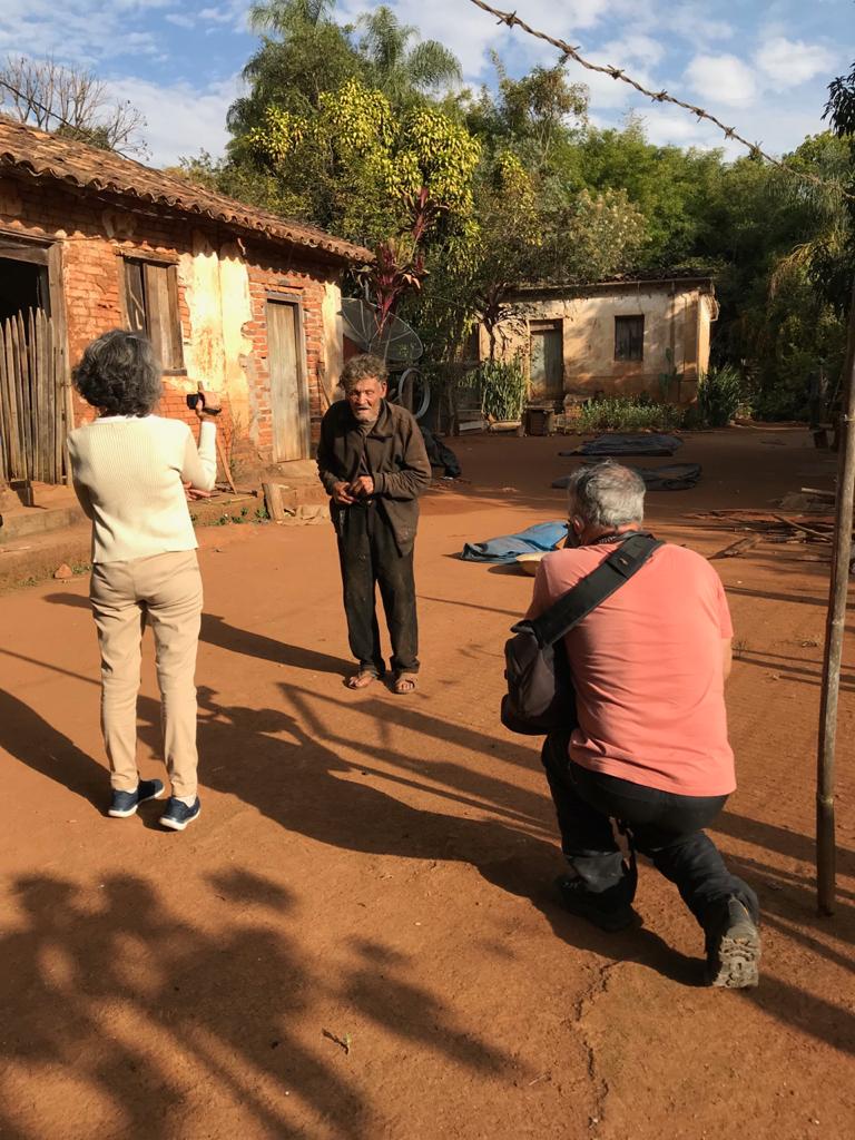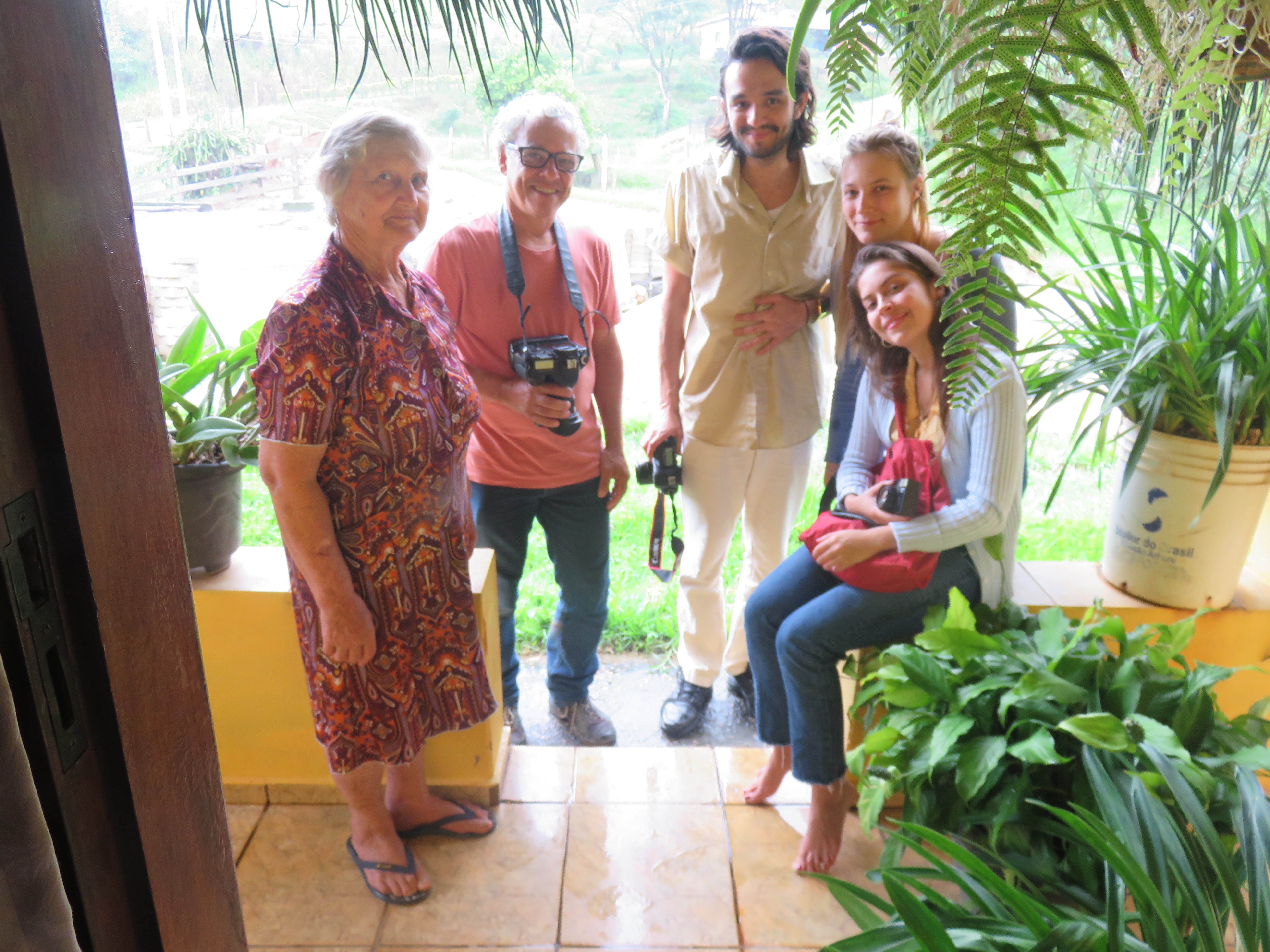 Da direita para a esquerda : Mestra Dona Leonor, D. Neusa, Rainha da Congada de S. Benedito e do Divino Espírito Santo de Socorro, Marinilda B. Boulay, Presidente do ITC,  Bruno Boulay, em primeiro plano Mestre Pedro. Ao fundo vemos os congos.