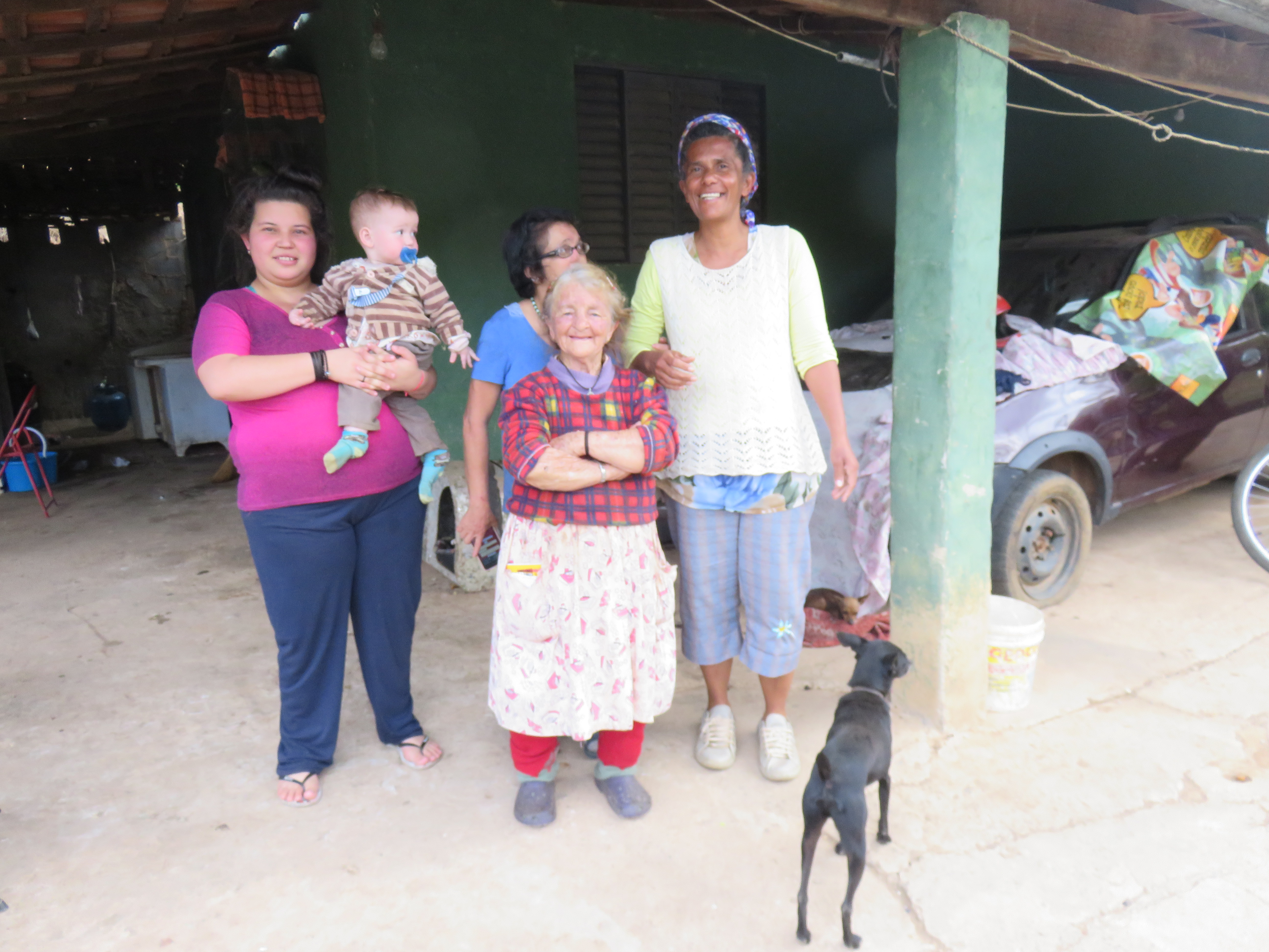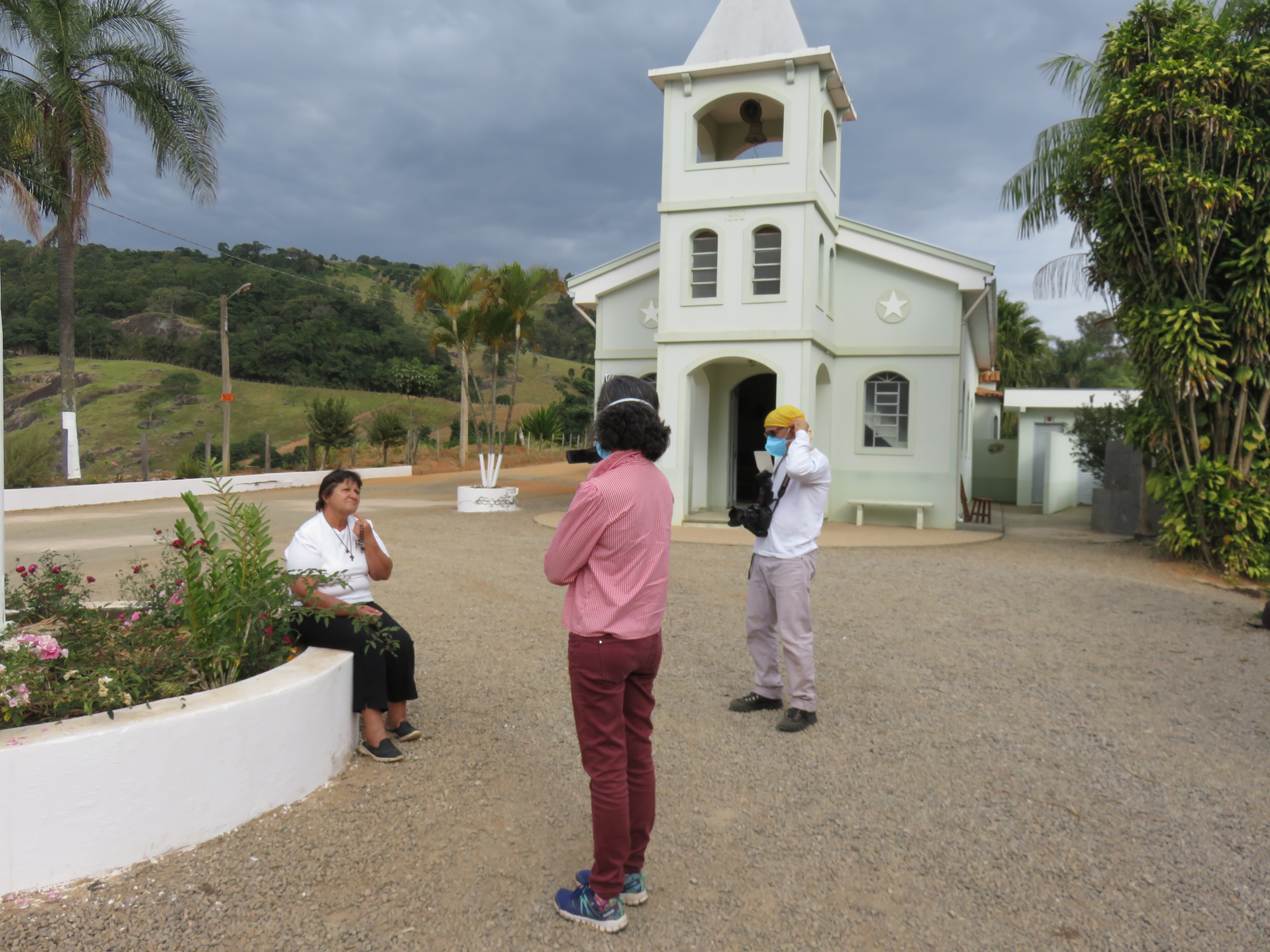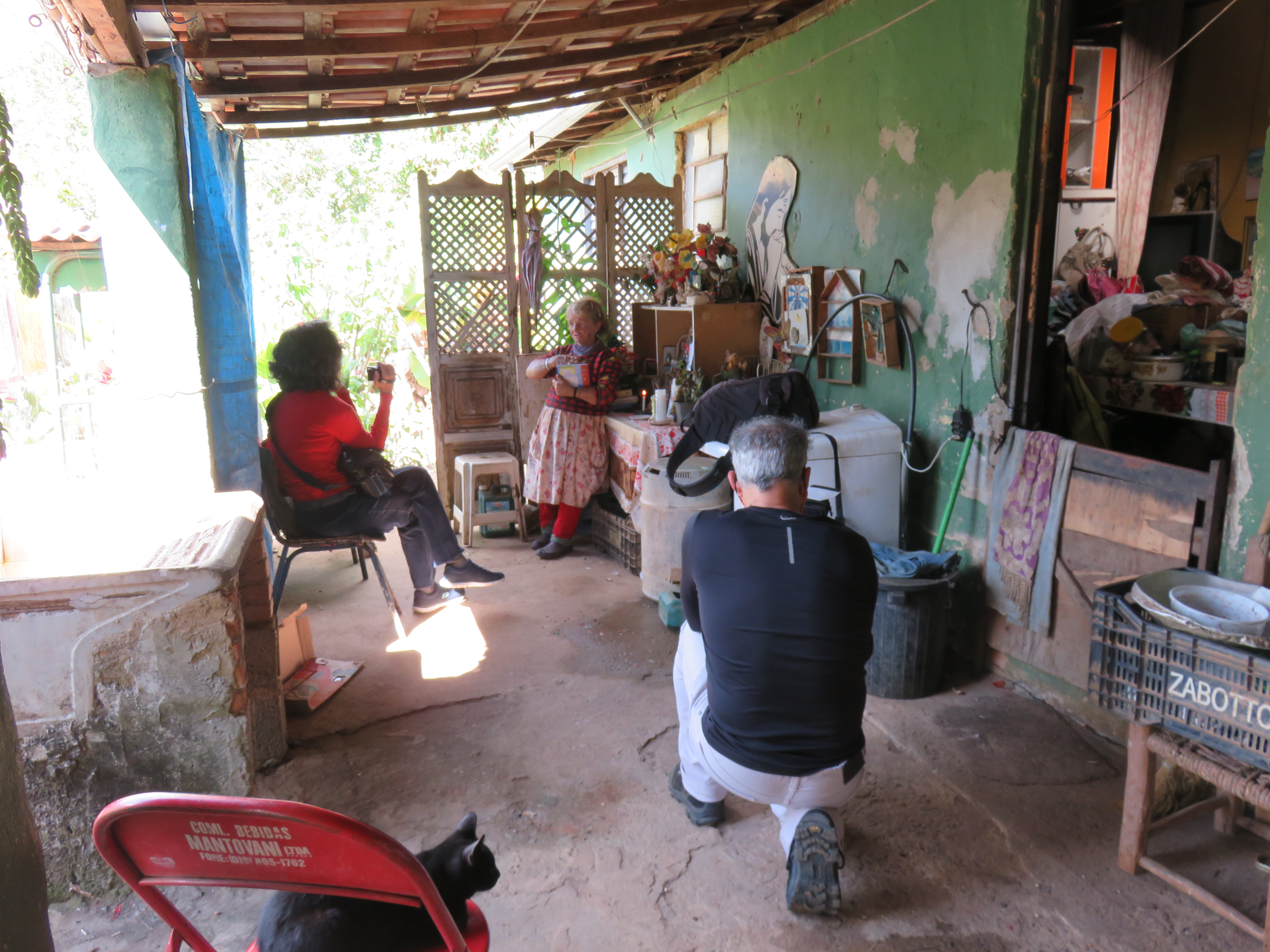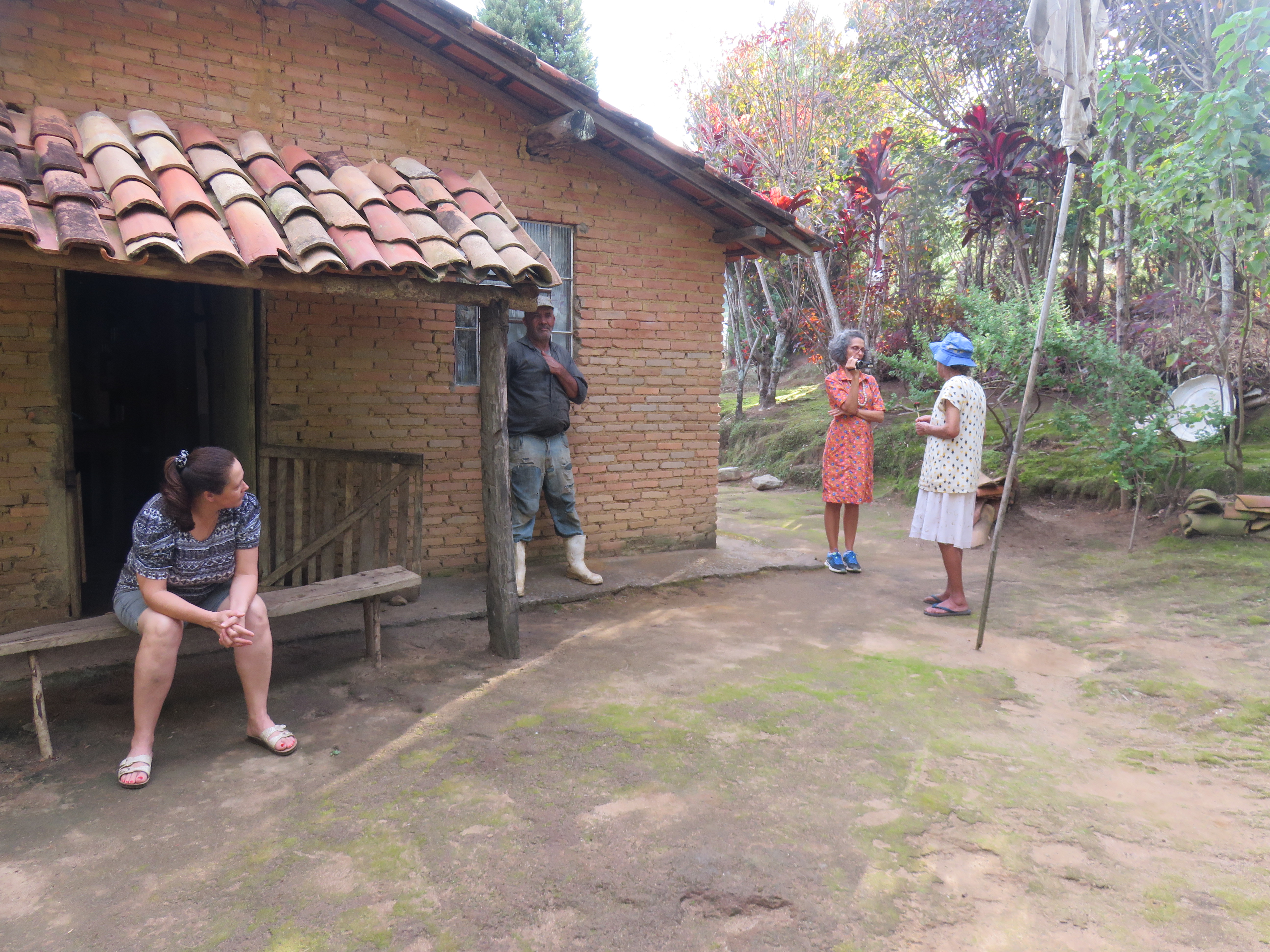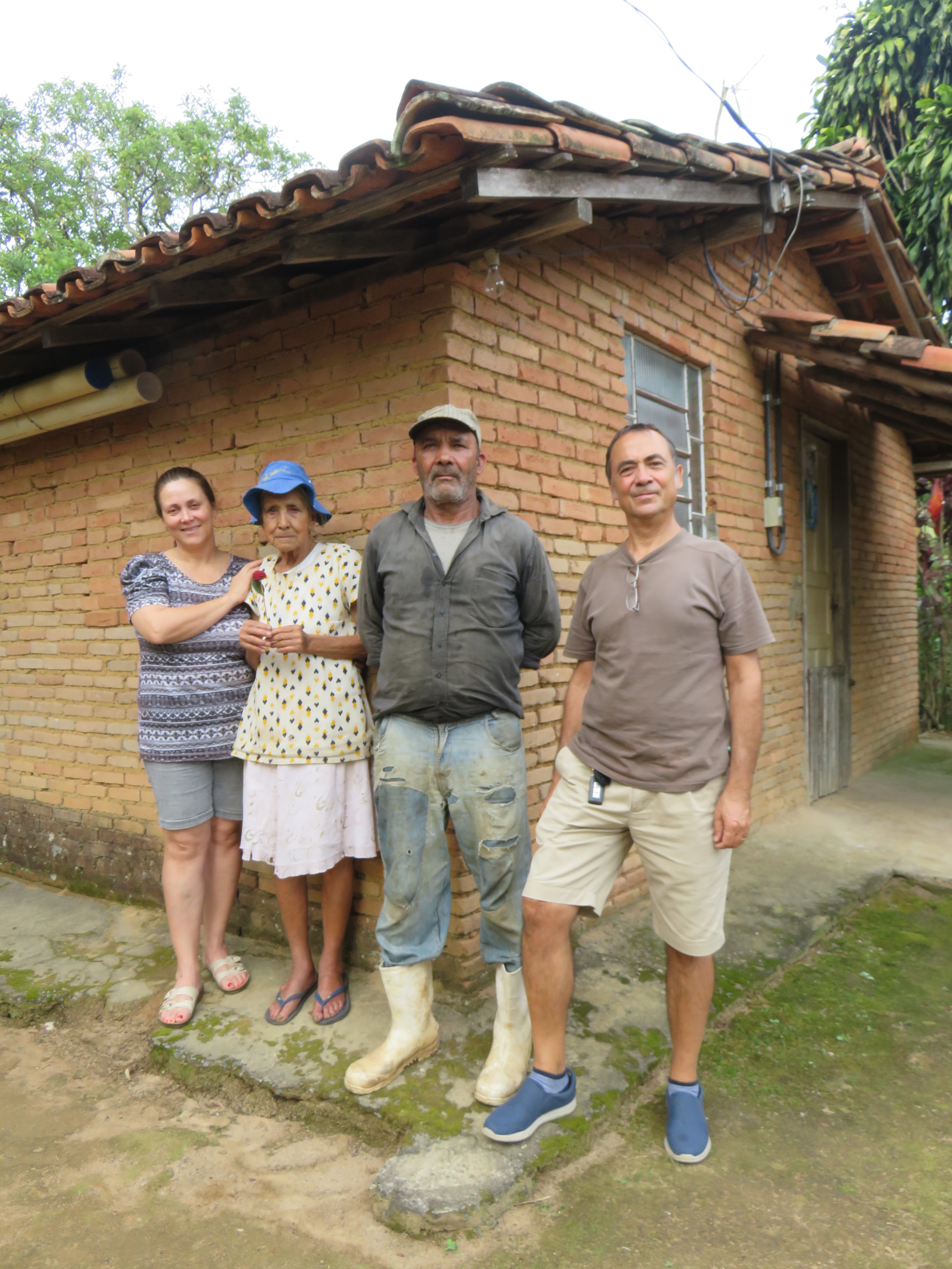 Primeira entrevista dentro do projeto: Dona Linda no Bairro do Ribeirão do Meio. Cuca Jorge, Clara, Capucine e Alexandre. Foto Marinilda Boulay – 10/02/2020Equipe com Dona Linda de esquerda para direita depois dela: Cuca Jorge, Alexandre, Capucine Levi e Clara De Ro.Segunda entrevista: Dita, Bairro do Brejo. A mesma equipe da primeira entrevista. Foto Marinilda Boulay – 10/02/2020.